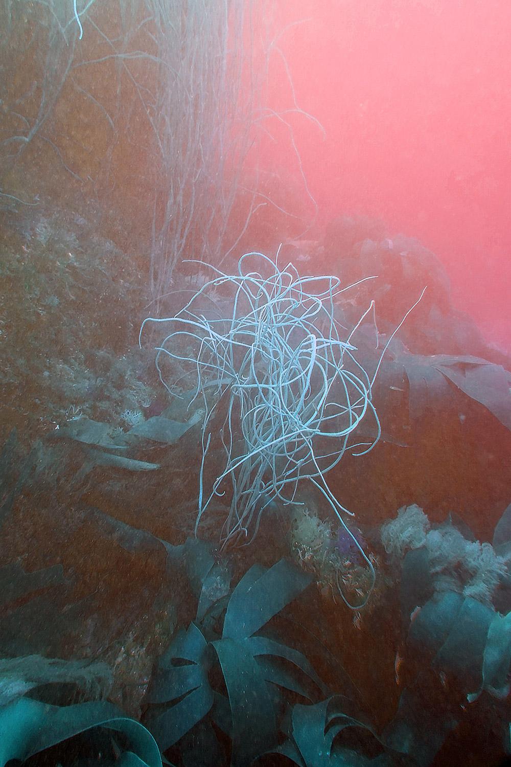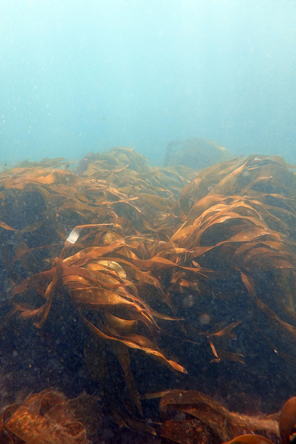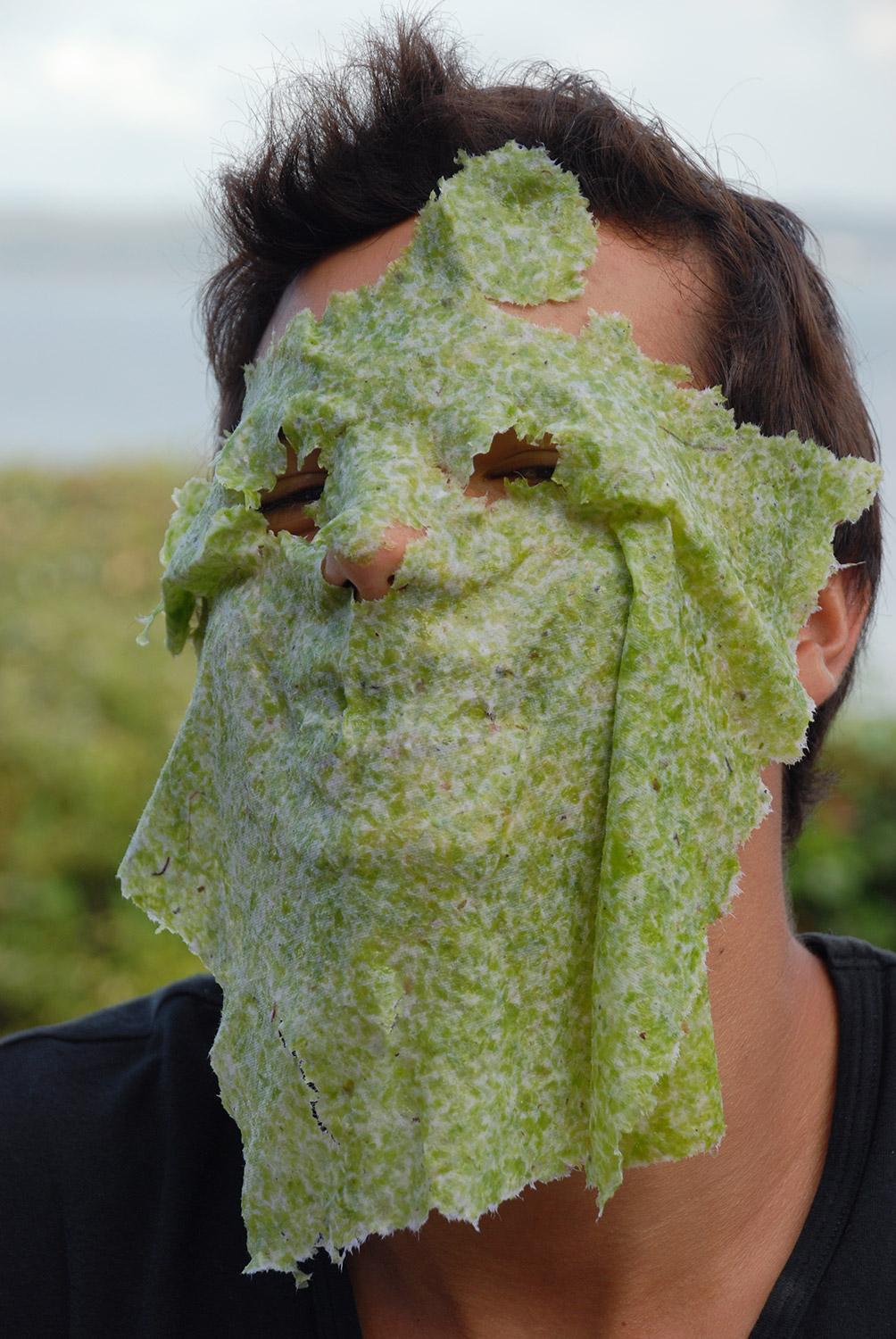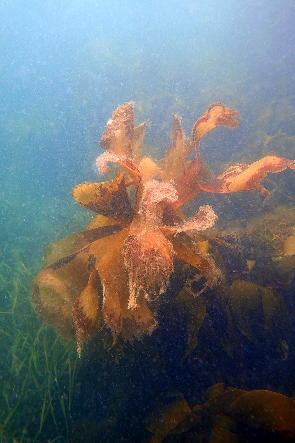 JV - For me, kelp symbolizes the power and vitality of algae. When we talk about algae forests and marine refuges for many animal species, we are talking about kelp. I have observed it while diving and photographed it many times along the coast around Locquirec, where it is very abundant. I have also collected them several times in an attempt to extract the alginate contained in the thalli. After a few hours in fresh water, the seaweed begins to release a sticky substance, which can then be filtered and recovered. I have used it to make some masks and have also incorporated it into paper pulp made from other species.