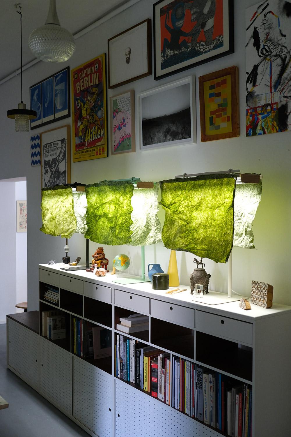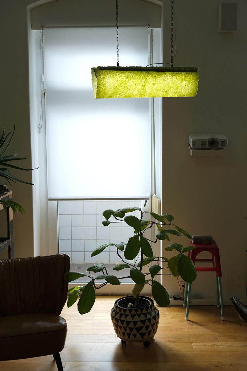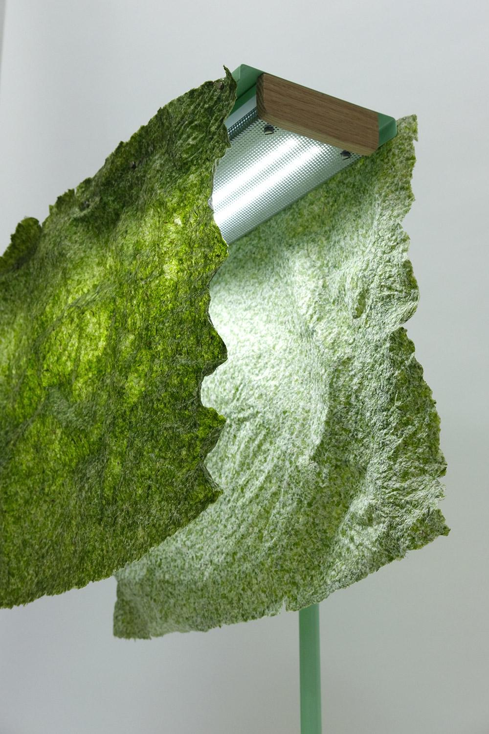 So what place could my seaweed paper have in this unique dialogue between art, design, and light? First of all, it is important to remember that seaweed would not exist without light: sunlight enables this marine plant to photosynthesize, reproduce, and create living matter. Then there is light again, which causes the depigmentation of Ulva washed up on the beach, leading to its bleaching and degradation. There is therefore an essential link between algae and light, which accompanies the life and death cycle of green tides, and this is precisely the idea revealed by the luminous presence of the seaweed paper lamps.