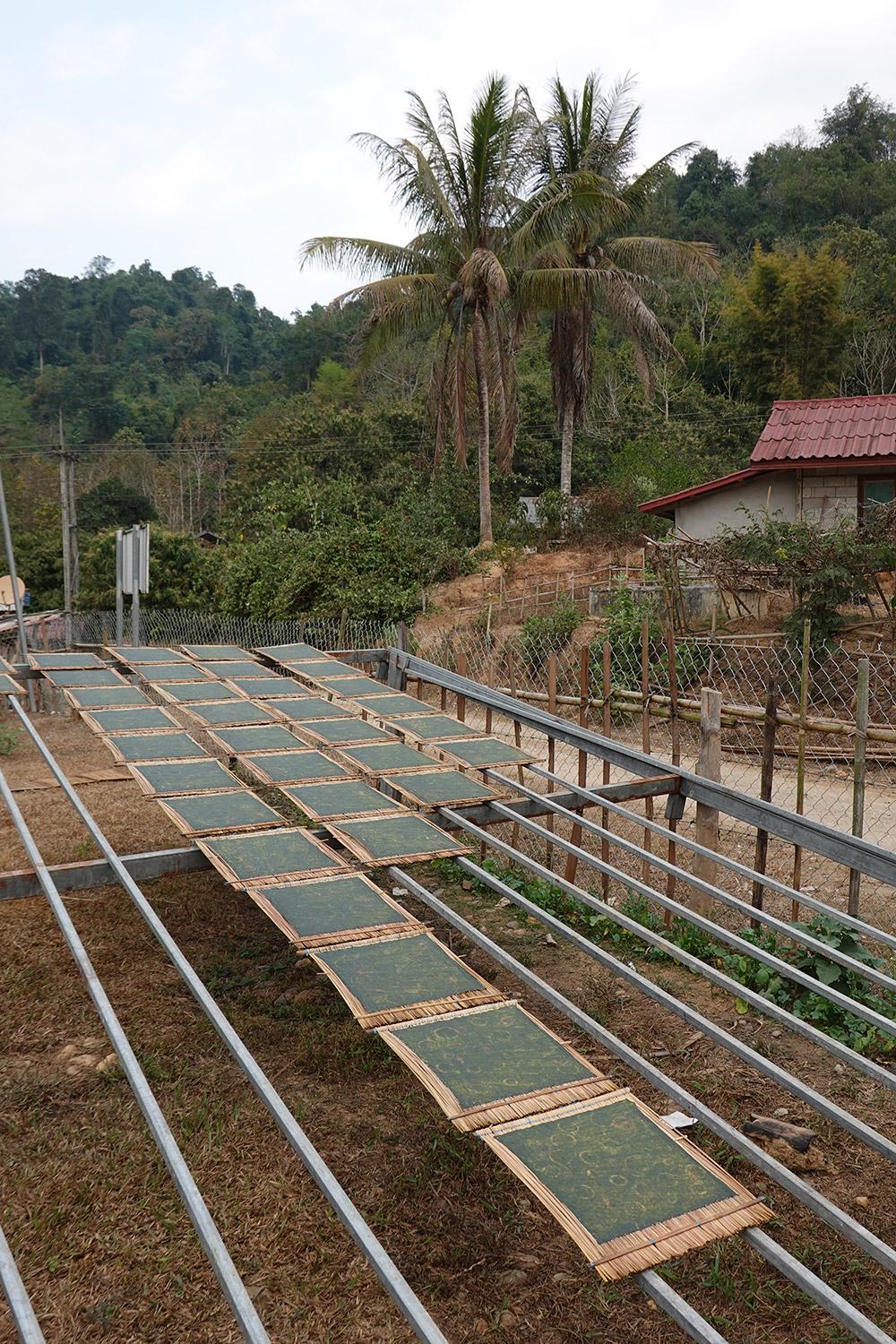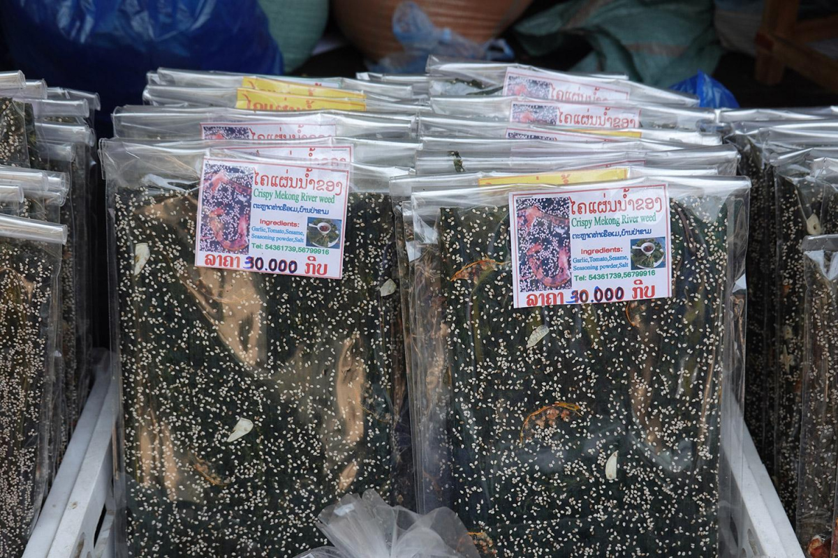 Now, all he can think about is getting back to his research and moving on. His goal in setting off this morning was to find one of the seaweed farms that he has seen several times through the window of the bus as it took him from Luang Prabang to Nong Khiaw. Here, kaipen—a kind of seaweed chip—is a national treasure. He had tried it as soon as he arrived in the country and couldn’t get enough. The seaweed’s vegetal taste is enhanced by the aroma of roasted sesame seeds, as well as chunks of fried tomato and onion. They can be eaten seasonally as an appetizer or as a side dish, and it’s a delicacy in Laos.