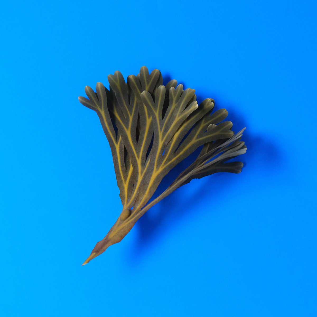 JV - Dulse is one of my favorite seaweeds! Its large red thalli can be spotted from miles away when diving, and it's always a wonder to see it swaying from side to side in the water column with the current. It turns brown as it dries, so I was able to turn it into dark-colored seaweed paper that stood out from its green counterparts. When it's still young, you can bite into it and it's also delicious in salads or on fish. I photographed several specimens against different colored backgrounds in the Photochromatics series, where its red hue worked wonders.