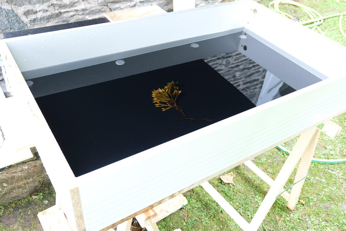 This short paragraph must have sparked something in my brain, because as soon as I finished reading it, I rushed to build a large, waterproof white box in which I could take my own pictures of algae. In an almost “Painlevesque” state of mind (in homage to the pioneer of aquatic documentary filmmaking Jean Painlevé), I decided to equip my new tool with a metal rail on which to slide a small video camera to shoot tracking shots and capture the algae in motion. But after nearly dropping the camera into the water half a dozen times, with mediocre results each time, I had to give up on the idea.