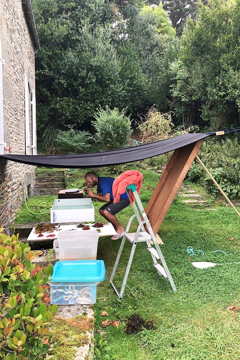All that remained was the aquarium to photograph the algae. I first wanted to capture the most common species around Locquirec: Ulva, Porphyra, Bifurcaria, Palmaria, Laminaria... Their colors were bright and shimmering when viewed in good weather while diving, but they lost their luster when removed from their natural environment. So I had the idea of placing a colored background at the bottom of the aquarium, above which the algae would float, to accentuate their shapes and give them relief. A neighborhood photographer's trick, in short. The kind who puts the Eiffel Tower in the background to hide your dull complexion. Anyway, I got caught up in the game because this simple addition of color to my compositions immediately had a striking effect. The Porphyra floated above a yellow background that seemed to warm its brown tones, the Fucus floated above a blue that recalled the abyss, and the subtle pink of the Heterosiphonia was highlighted by a light gray that mimicked a sandy bottom on a clear day. While I could have achieved the same effects on a computer by processing my photos with image editing software, this little old-fashioned trick allowed me to spend more time with the algae, fine-tuning my outdoor shooting setup and continuing to tinker.