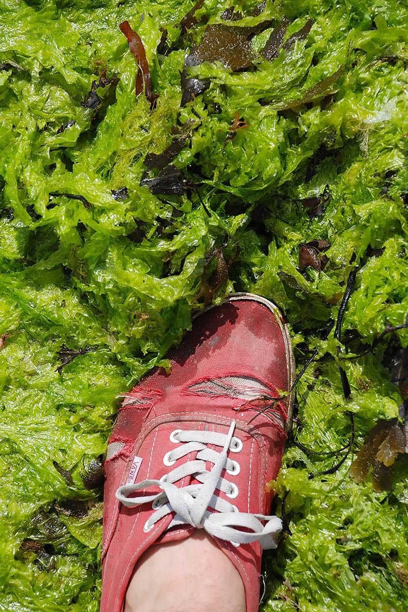 JV - It was Ulva that got me interested in algae! During the big green tides of summer, it can be found everywhere on the beaches of Brittany. Tourists complain that it spoils the beaches, environmentalists abhor it because it threatens other species, and it can even be dangerous to humans when it rots and releases toxic gases. I've made paper out of it... Beautiful, bright green leaves that I have used in various projects and exhibitions. It is very thin and transparent, and easier to work with than any other species of seaweed. I collect it on the foreshore at low tide in Locquirec or Saint-Michel-en-Grève.